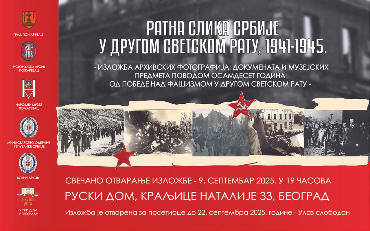 U Ruskome domu u Beogradu sutra će biti otvorena izložba pod nazivom „Ratna slika Srbije u Drugom svetskom ratu, 1941–1945“, koju su pripremili Istorijski arhiv Požarevac, Vojni arhiv, Vojni muzej i Narodni muzej Požarevac, pod pokroviteljstvom Grada Požarevca i Ministarstva odbrane Republike Srbije.Ova izložba predstavlja važan doprinos očuvanju sećanja na period rata, podvige oslobodilaca i antifašističke tradicije, ali i doprinos obeležavanju sedamdeset godina od pobede nad fašizmom.