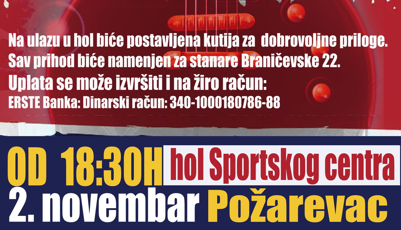 U subotu, 2. novembra, u Sportskom centru Požarevac, biće održana humanitarna rok svirka. Prikupljena novčana sredstva biće uplaćena na račun Stambene zajednice Braničevska 22.Nastavljaju se akcije prikupljanja pomoći stanarima iz Braničevske 22, koji su pre nešto više od mesec dana ostali bez svojih domova.