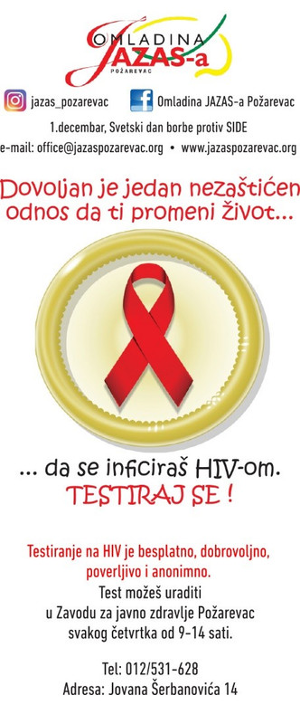 Ove godine uz podršku Grada Požarevca i Timočkog omladinskog centra (Zaječar), a povodom 1. decembra, Svetskog dana borbe protiv side, Omladina JAZAS-a Požarevac realizuje kampanju „TESTiraj se na HIV, saznaj svoj HIV status, sa HIV-om se živi“ kako bi još jednom podsetili na važnost ranog otkrivanja HIV infekcije i lečenja uz antiretrovirusnu terapiju koja smanjuje delovanje HIV-a na imuni sistem organizma i produžava život osobama koje žive sa hiv-om.